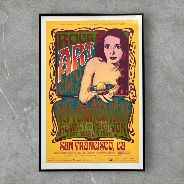 (1995)ROCK ART EXPO ’95 イベント告知用 シルクスクリーンポスター こちらのポスターは、90年代に開催されたロックポスター展のための告知ポスターとなります。 デザインしたのは、Scott Mcdougall。 彼は1970年代初頭よりコンサートポスター制作で活躍。2000年以降はGrateful DeadのCDジャケット・デザインにも携わっています。 デッドストック並のシルクスクリーンポスターは貴重。サイケムーブメント全盛より磨き上げられた表現技法をふんだんに用いて、当時の高揚感を蘇らせるべくデザイン。カラーリングも相まって、各色の境界が鮮やかに浮き上がって見えます。 1stプリント、エンボスサイン入り。 フレームサイズはオーダーでぴったり合わせました。 大変見栄えよく仕上げてあります。 【Wes Wilson/ROCK POSTER EXPO】 1960年代の中期~後期にポスター制作で活躍。 当時、サンフランシスコはサイケデリック・コンサートののメッカとされ、ミュージシャンが毎晩のようにコンサートを行い、そのイベント毎にデザイナーたちが数多くの告知用のポスターを制作していました。 なかでもWes Wilsonは、余白を文字で埋めつくすスタイルを独自の感性で発展させていき、当時のカルチャーを特徴づける酩酊感・高揚感を表現します。 極端に変形したフォントはサイケデザインの象徴として、ミュージシャンやライブイベントの認知と、ポスター自体の芸術的地位の向上に寄与しました。 そんな彼が90年代に入ってから、改めてコンサートポスターがもたらす興奮や芸術性の高さを世に広めるために企画したポスター展が、「ROCK POSTER EXPO」となります。※開催年により名称が異なります。 ------------------------------------------ ROCK ART EXPO ’95 ■主催:Wes Wilson(ウェス・ウィルソン) ■開催日:1995/9/16,17 ■デザイン:Scott Mcdougall(スコット・マクドゥーガル) ■年代:1995年 ■サイズ:545×364mm ■買い付けた国:USA ■証明のためのエンボス入り ●額縁 サイズ:オーダーサイズ フレーム内幅:364×545mm フレーム幅:10㎜ 素材:フレーム:アルミ フロントパネル:再生プラ