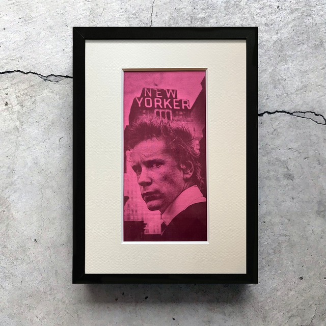■ John Lydon(ジョン・ライドン) 1986年、UK音楽誌に掲載された ジョン・ライドン(John Lydon)の写真切り抜きです。 Sex Pistols(セックス・ピストルズ)から Public Image Ltd.(パブリック・イメージ・リミテッド)へと続く、 ポストパンク以降を象徴する存在であるライドンを捉えた一枚。 写真家 アントン・コービン(Anton Corbijn)による撮影。 80年代UK音楽シーンを代表するフォトグラファーならではの、 緊張感と陰影を感じさせるポートレートです。 紙面は経年により色味がやや薄くなっているため、 現在はピンク色のクリア塩ビ(プラスチックシート)を挟んで額装しています。 これにより、写真全体にコントラストと独特の雰囲気が加えられています。 2mm厚のマット紙を使用し、 紙面を保護しながら、作品としての完成度を高めています。 額縁付き。 卓上・壁掛けどちらでもお楽しみいただけます。 壁掛け用の紐は付属しておりません。 ■アーティスト:John Lydon(ジョン・ライドン) ■写真家:Anton Corbijn(アントン・コービン) ■年代:1986年 ■スクラップサイズ:約215 × 104mm ■雑誌:UK音楽誌(NME) ■買付国:UK ■仕様:2mmマット紙+ピンク色クリア塩ビ ■コンディション:経年による色の薄さあり(ピンク塩ビにより印象は良好) ●額縁 サイズ:A4フレーム 額外寸:235 × 325mm 内寸:210 × 297mm マット厚み:2mm