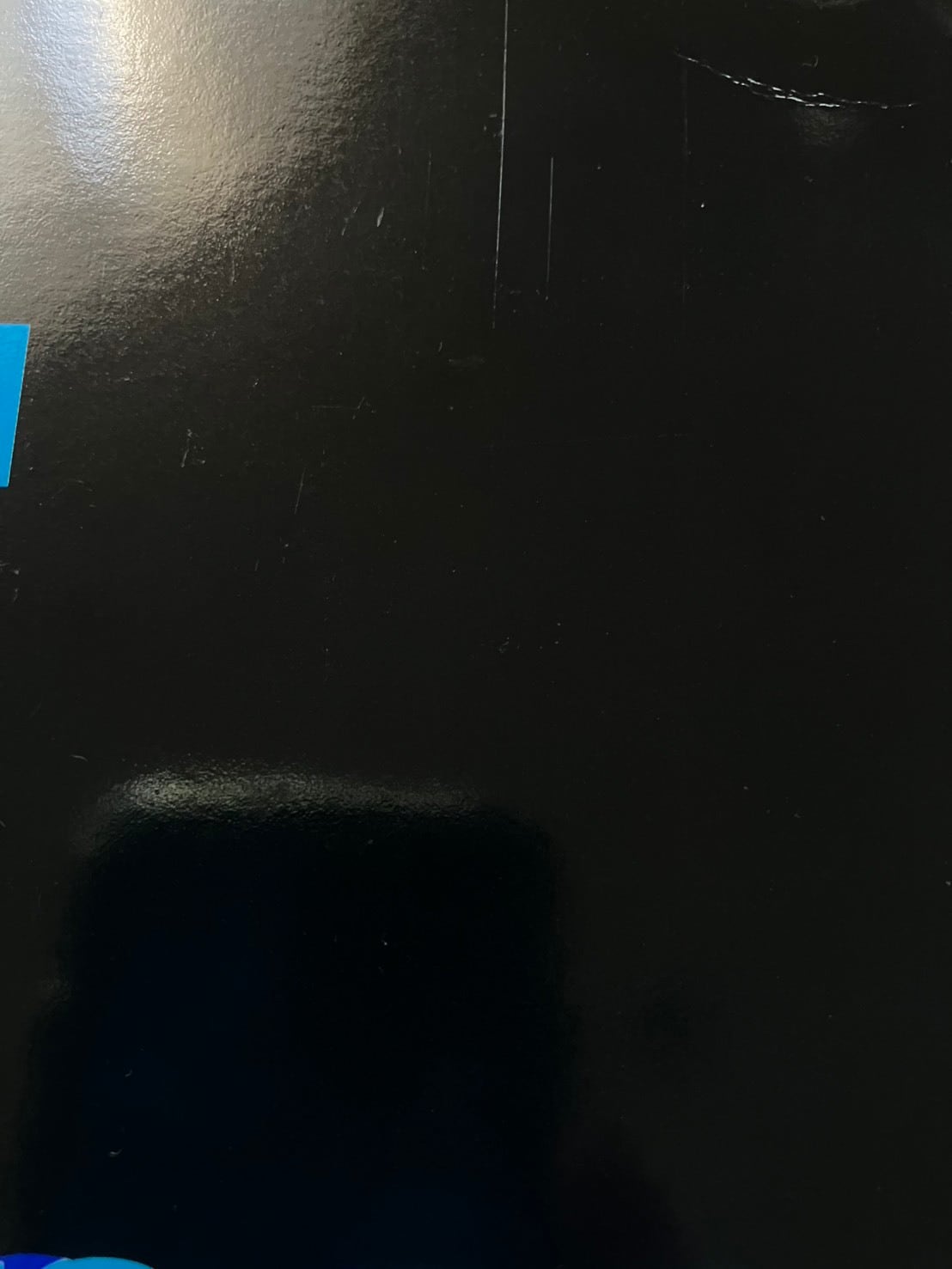 ロゴ下に薄い色ムラ、右上にしわが見られます。