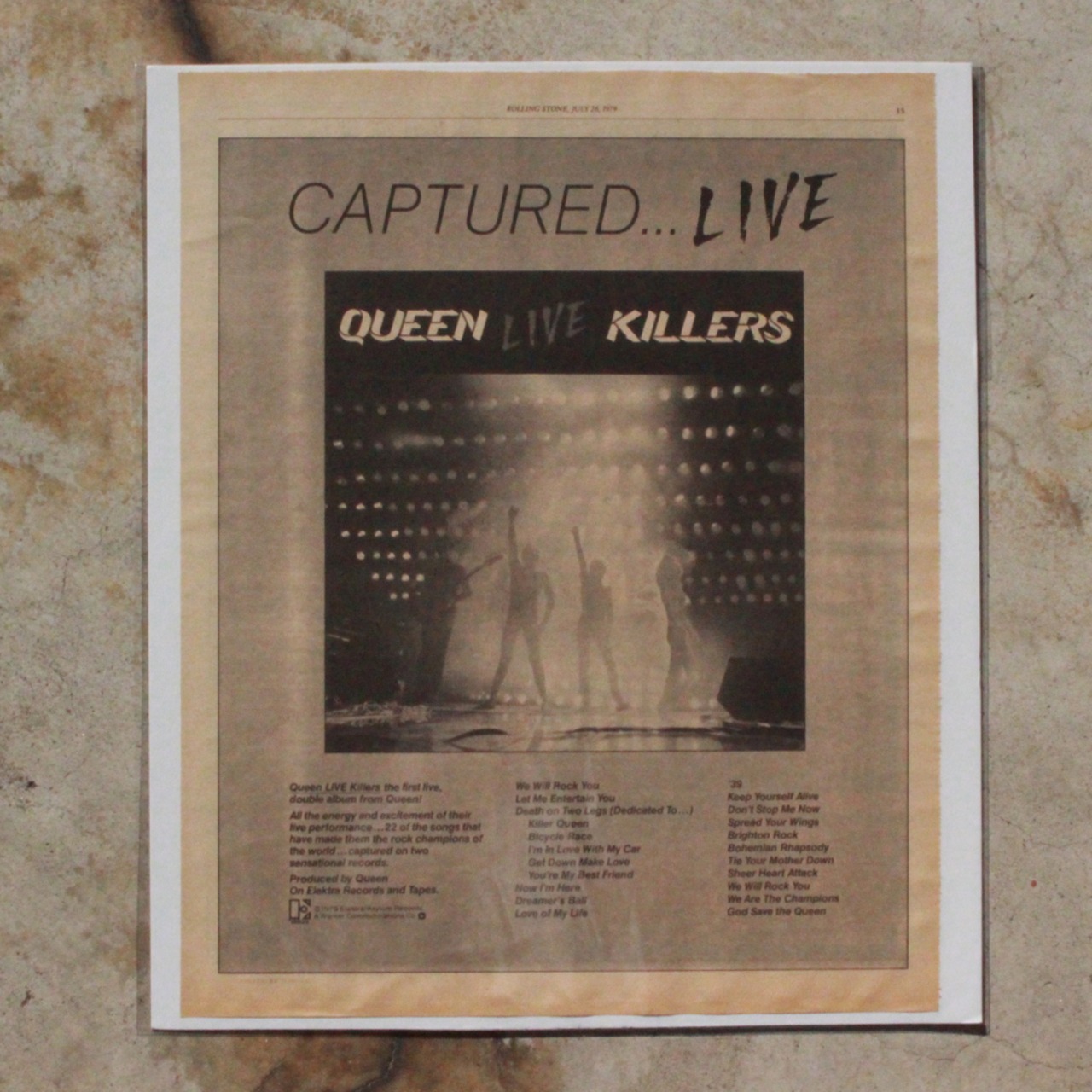 Queenのライブアルバム「Live Killers」の広告。